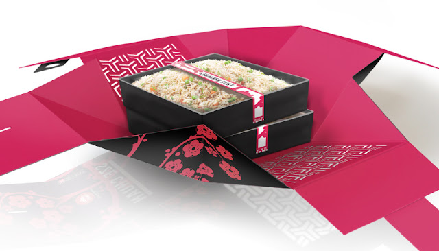 Without using a lot of paper it makes a solid pack to carry. In two sides a pattern is cut out, linked to the country the meals origin lays and which makes it possible for the customor to check out the food trays. Colours and graphics will label the different meals to choose from. Once unfolded the box opens like a coloured (lotus)flower in order to present the four boxes inside in a tasty and stylish way.